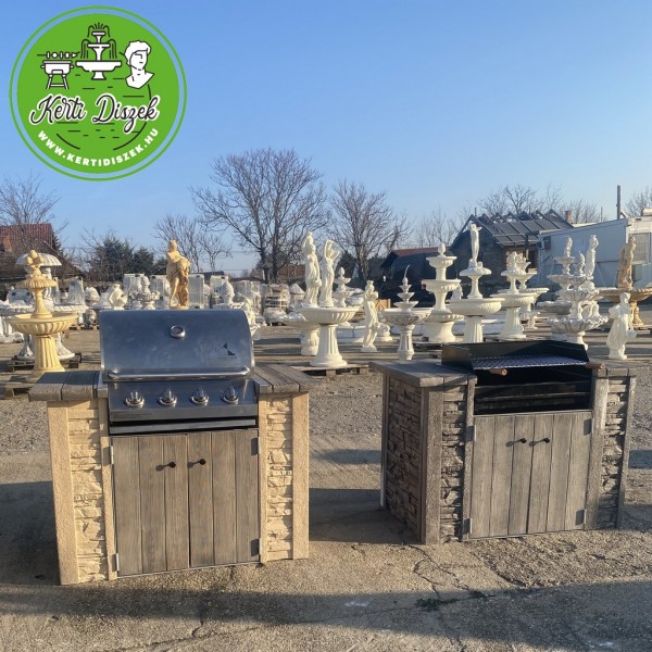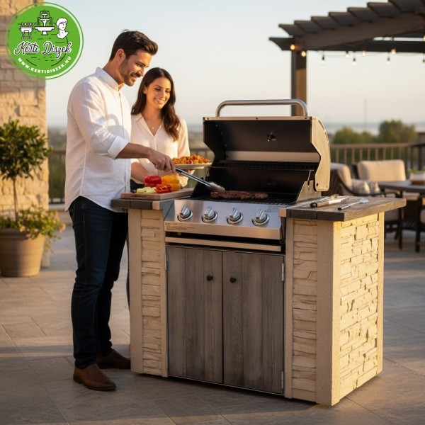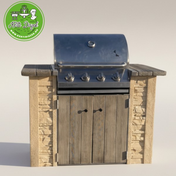 Prémium, időjárásálló burkolat: A konyha alapja stabil, porfestett acél vázra épül, amelyet a kép alapján kétféle, természetes hatású burkolat egészít ki. A beépített gázgrill két oldalán elegáns, kőburkolat hatású panel található, ami a vidéki hangulatot idézi, míg az alsó szekrényajtók meleg, sötétbarna faerezetű mintázatot kaptak. Ez a kombináció egyszerre modern és időtlen, garantálva, hogy a konyha harmonikusan illeszkedjen a kerti környezetbe.