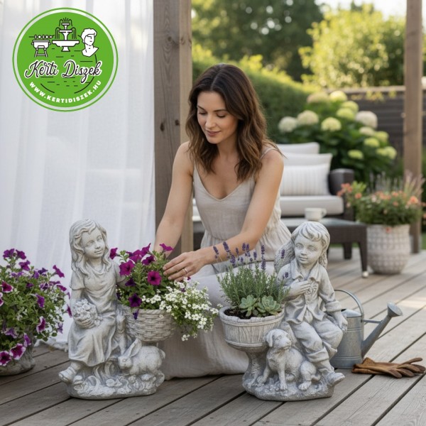 Fiú szobor virágtartóval kerti dekoráció
