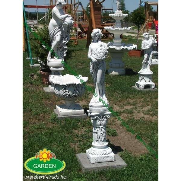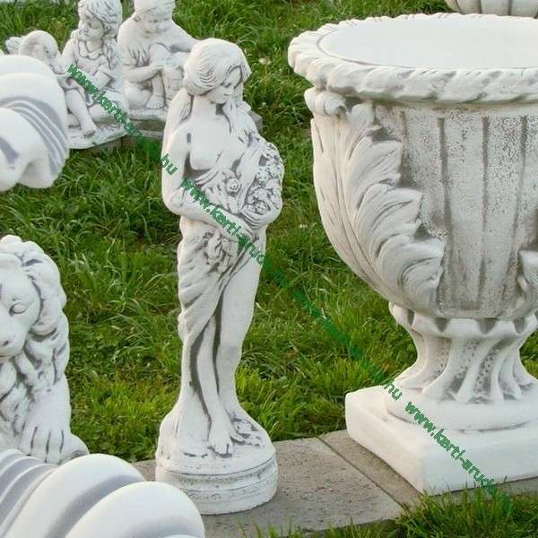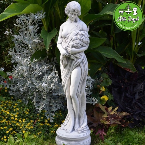 A kiskertbe belépő látogató, a kert adottságait élvezni kívánó tulajdonos figyelmét, tekintetét irányítsuk a kis kert „nagy tereire”. Helyezzünk el a kertbe tekintetet vonzó kis szobrot, mivel a szép kerti dísztárgyak, mint például ez a virágcsokros női szobor elvonja figyelmet a kert méreteiről.