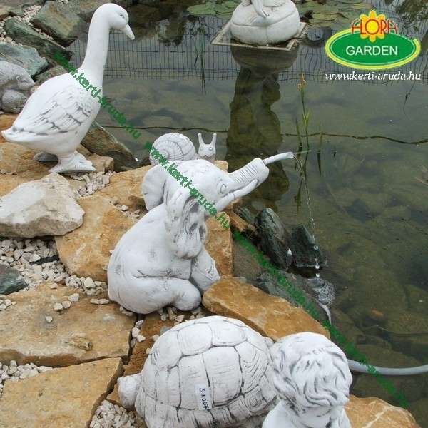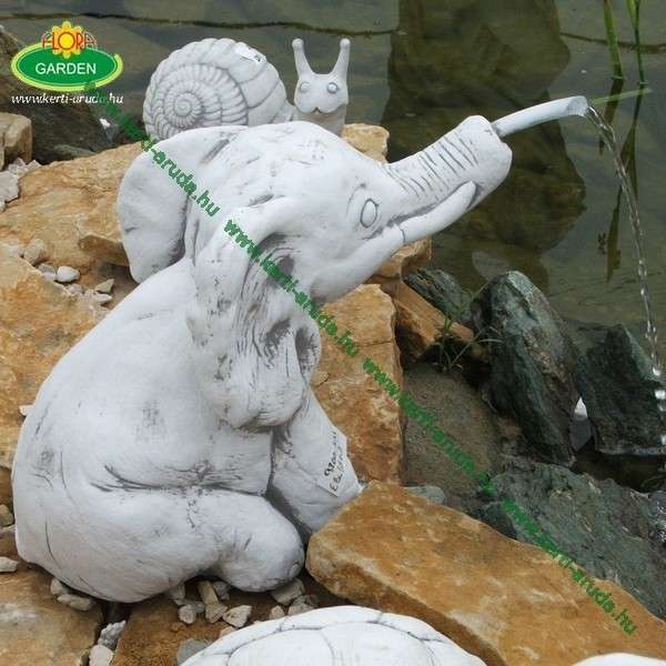 Az elefánt vízköpő figuránk nagyon látványos és aranyos kerti tavak szélére helyezve. Rendkívül látványos, ahogy az ormányából távozik a víz. Szimbólumként is használható. A Feng Shui szerint az elefánt jelentése otthonunkban: A nyugalom, a nagyság, az ész és a szerencse megtestesítője. Szimbolizálja a bölcsességet, az erőt, és a kitartást is. Szerencsét és jó egészséget hoz...
